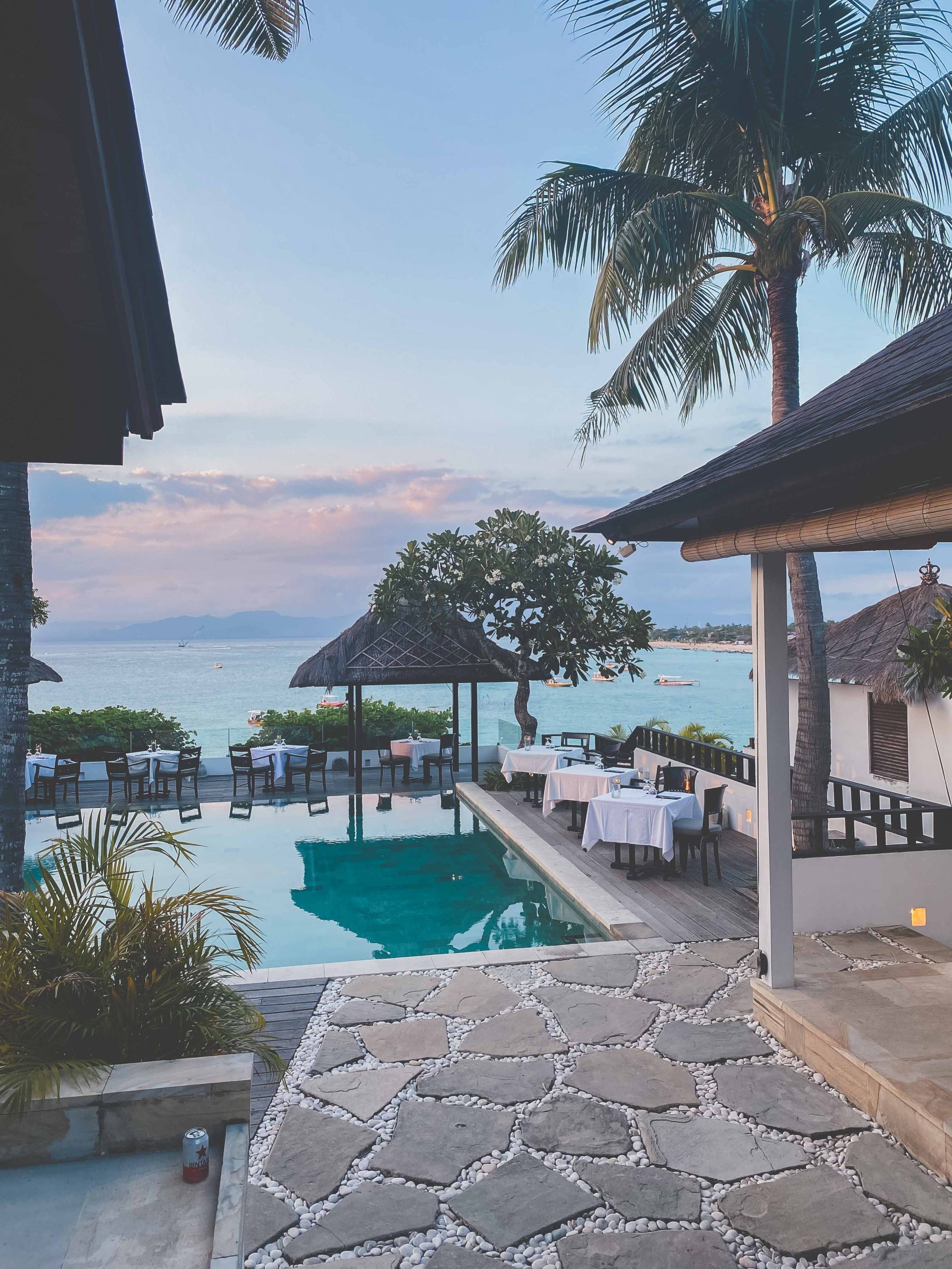 A serene outdoor restaurant at Batu Karang Resort Nusa Lembongan, with white-clothed tables, overlooks a pool and the ocean, surrounded by palm trees and tropical greenery under a pink and blue evening sky.