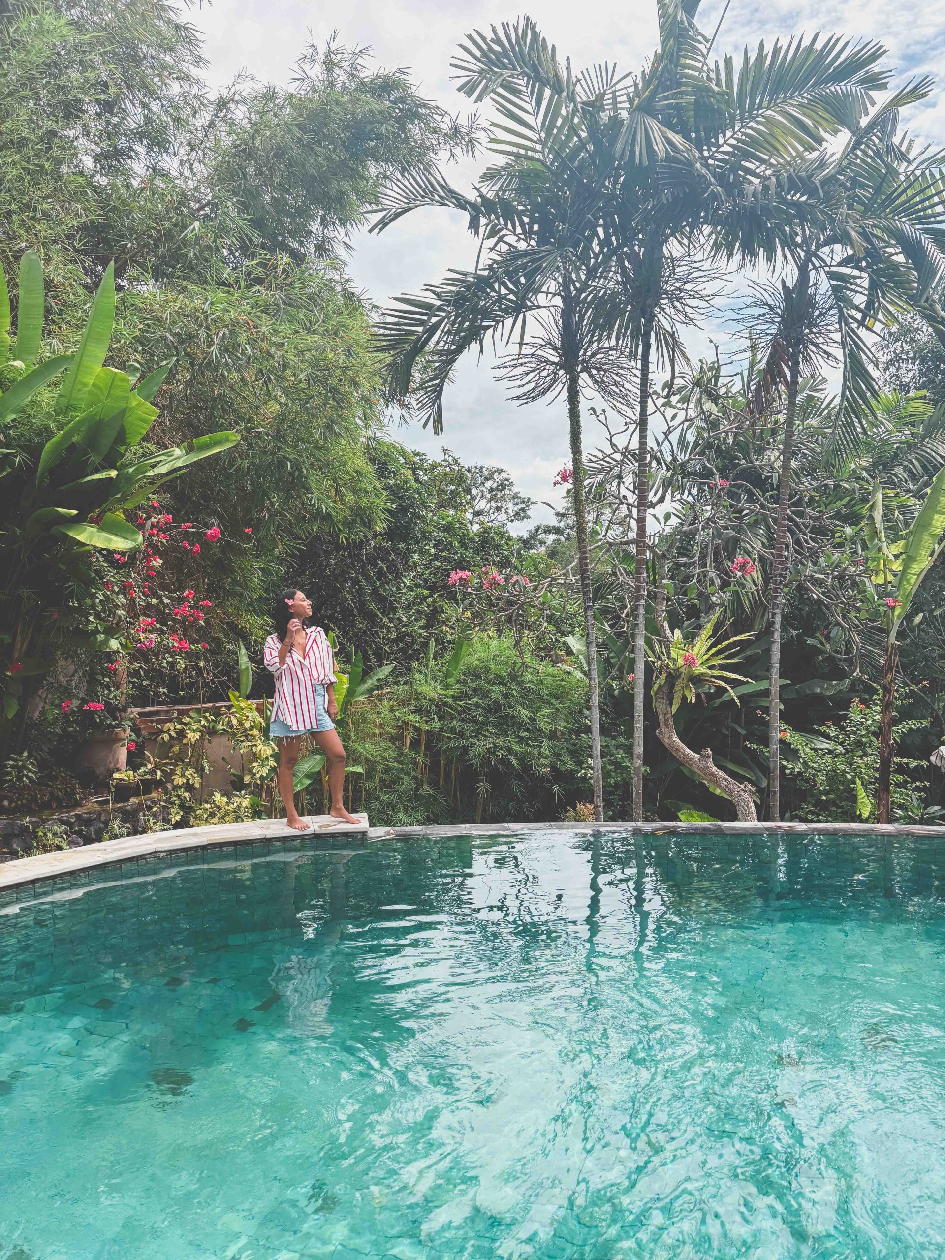A woman in a striped dress stands barefoot at the edge of a clear turquoise pool near Seseh Beach, surrounded by lush tropical plants, palm trees, and vibrant flowers on a cloudy day.